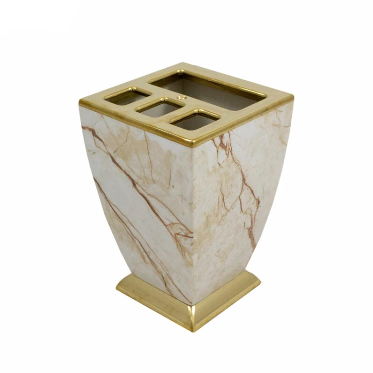 سرویس دستشویی پنج پارچه هارمونی مدل آوا با رنگ سفید طلا، طراحی کلاسیک و شیک، جلوهای بینظیر به سرویس بهداشتی شما میبخشد. این سرویس شامل سطل، برس، جامایع، جامسواک و جاصابون است که به راحتی میتوانید تمام لوازم ضروری حمام را در یک مجموعه زیبا و هماهنگ داشته باشید.